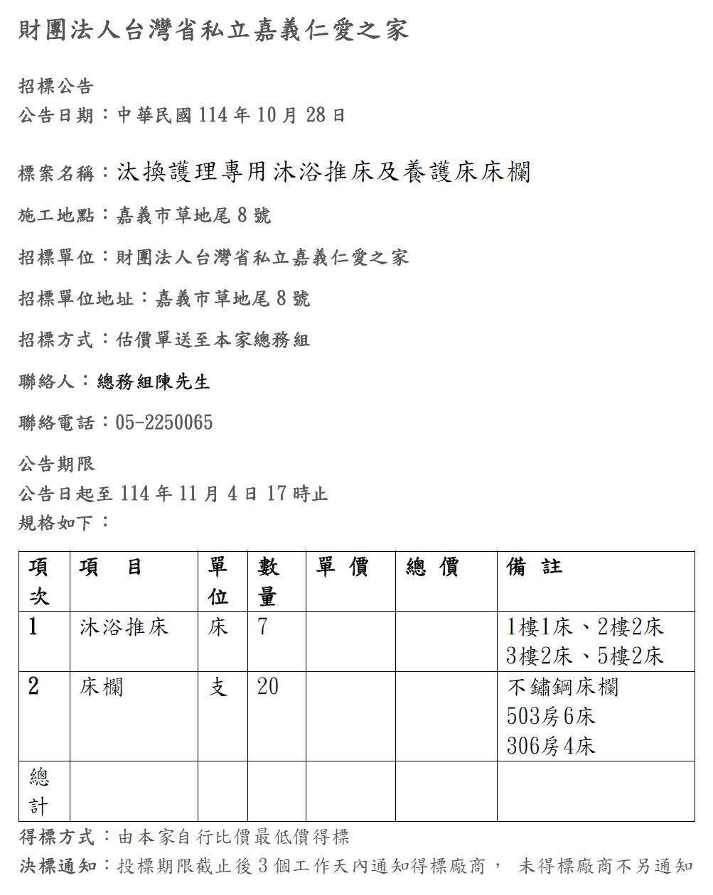 招標公告-汰換護理專用沐浴推床及養護床床欄