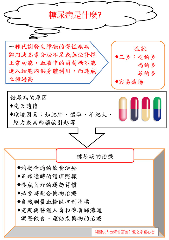 ![]() 血流衝過血管所造成的壓力稱之為血壓。高血壓為臺灣十大死因之一,正常成年人收縮壓應小於130mmHg,舒張壓小於85mmHg;一般來說,若收縮壓>140mmHg,舒張壓>90mmHg,則可判定可能有高血壓。少許的患者可能出現頭痛、頭暈等症狀,但大部分的患者是沒有明顯差異的,未定期測量的成年人發現時,往往合併許多心血管疾病的產生。 二、為什麼會發生糖尿病?: 糖尿病的發生與遺傳體質相當有關係, 其他如肥胖、情緒壓力、懷孕、藥物、營養失調,都會促使糖尿病的發生。 三、糖尿病有什麼症狀? 發病初期,大多數人都沒有症狀,除非做健康檢查,否則不易發現。若沒有控制好,病情隨時間加重,血糖逐漸升高時,才會有3多(多吃、多喝、多尿)疲勞、體重減輕、視力模糊、陰部搔癢或或傷口不易癒合等症狀出現。 四、糖尿病如何控制? 糖尿病的控制,有賴於運動、飲食、藥物(口服抗糖尿病藥或注射胰島素)三者間的互相配合,並與醫師、護理師、營養師討論如何配合。 五、什麼是糖化血色素? 因為血糖會受到許多因素的影響而變動,因此,要瞭解血糖是否控治療好,測量飯前或飯後血糖之外,建議應定期檢測糖化血色素。 糖化血色素(A1C)是指「血糖」會與紅血球的「血色素」相結合。長期血糖越高與血色素結合越多,糖化血色素的數值越高,糖化血色素的數值可以間接代表抽血前三個月平均血糖的控制情形。沒有糖尿病的人,糖化血色素的標準為小於6%,糖尿病人糖化血色素應控制在7%以下。 、藥物(口服抗糖尿病藥或注射胰島素)三者間的互相配合,並與醫師、護理師、營養師討論如何配合。 六、糖尿病定期檢驗項目及控制目標: