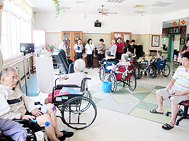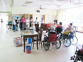 嘉義教會的志工們來到本家關懷長者,並帶來創世紀、信耶穌及認罪悔改...等歌曲的演唱,讓長者們獲得愉快的心情。