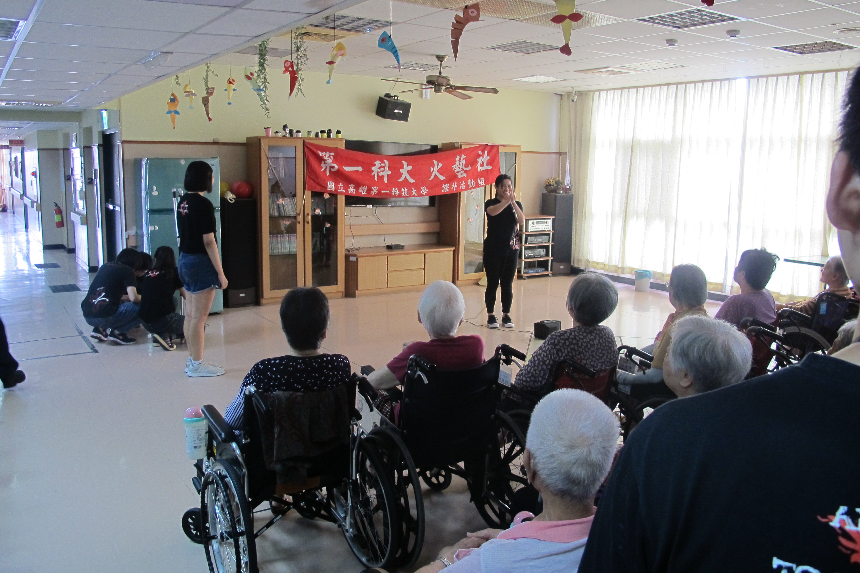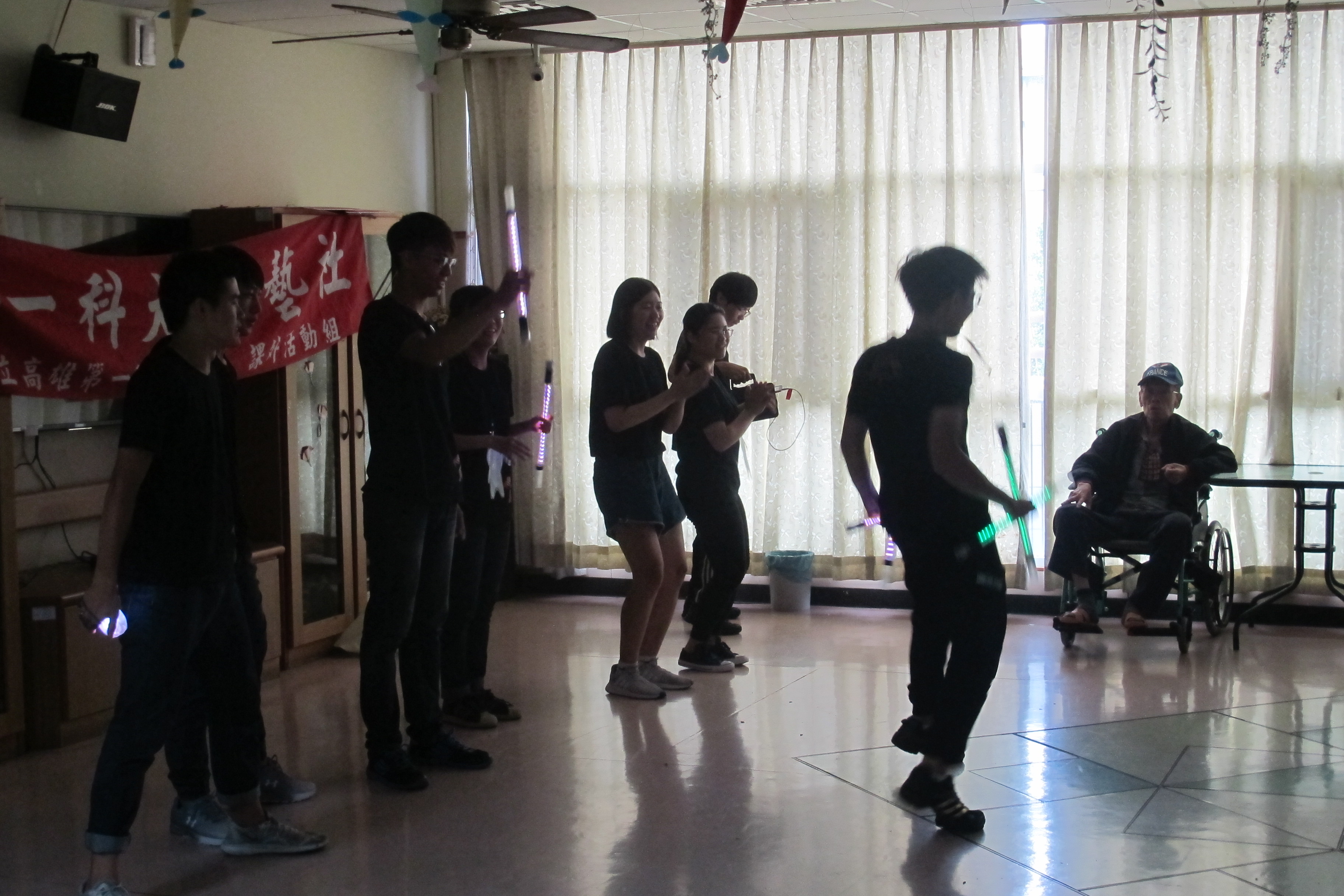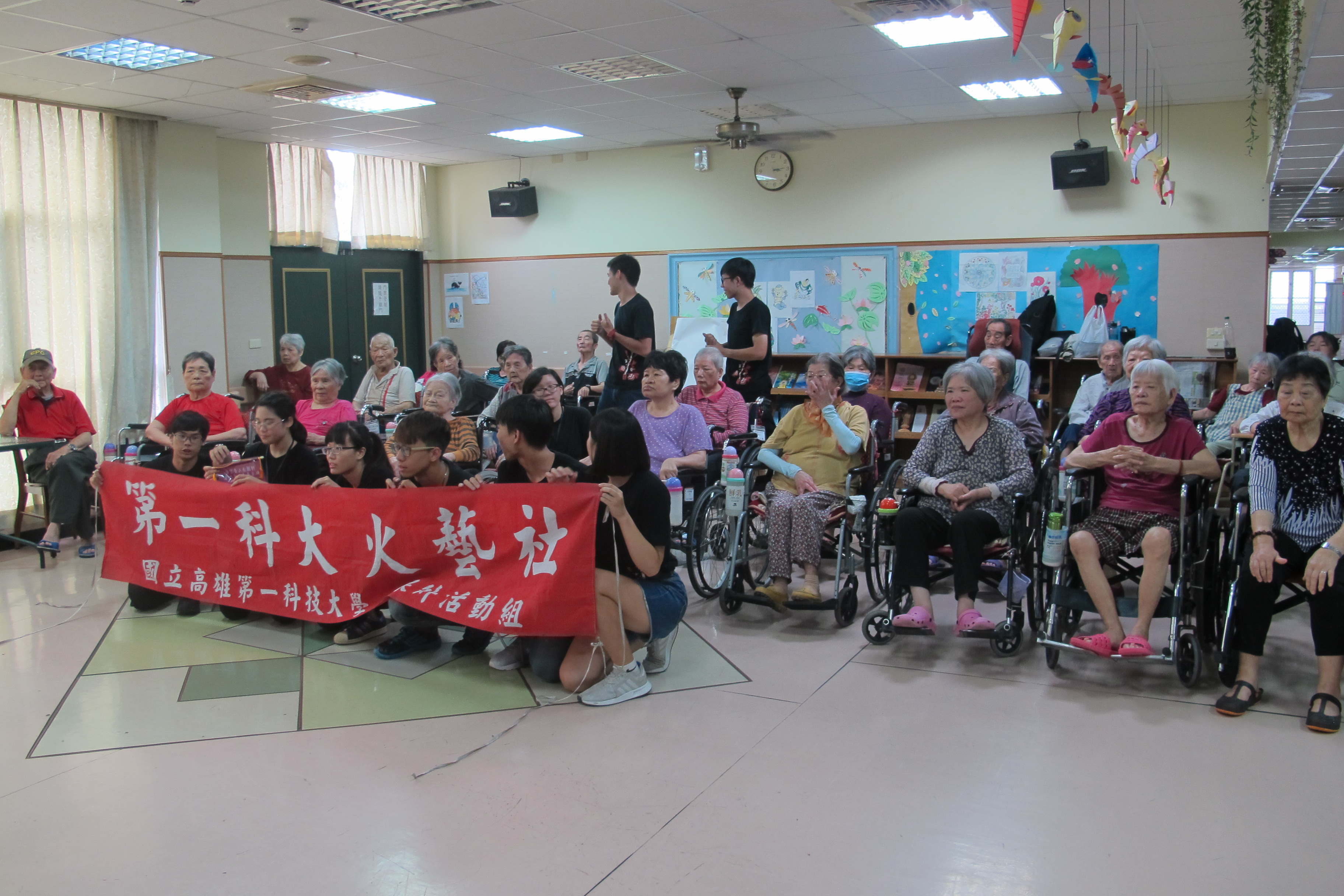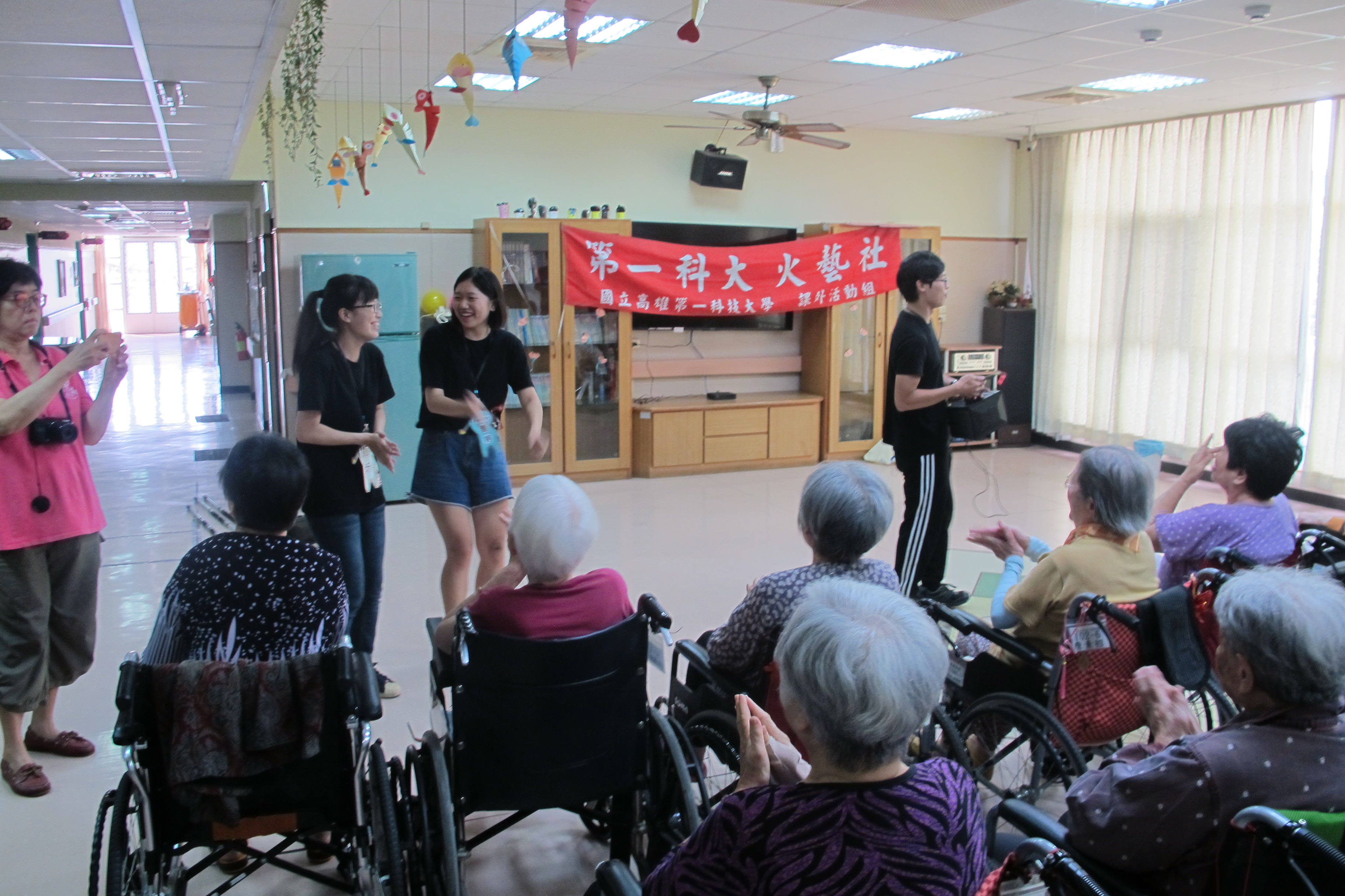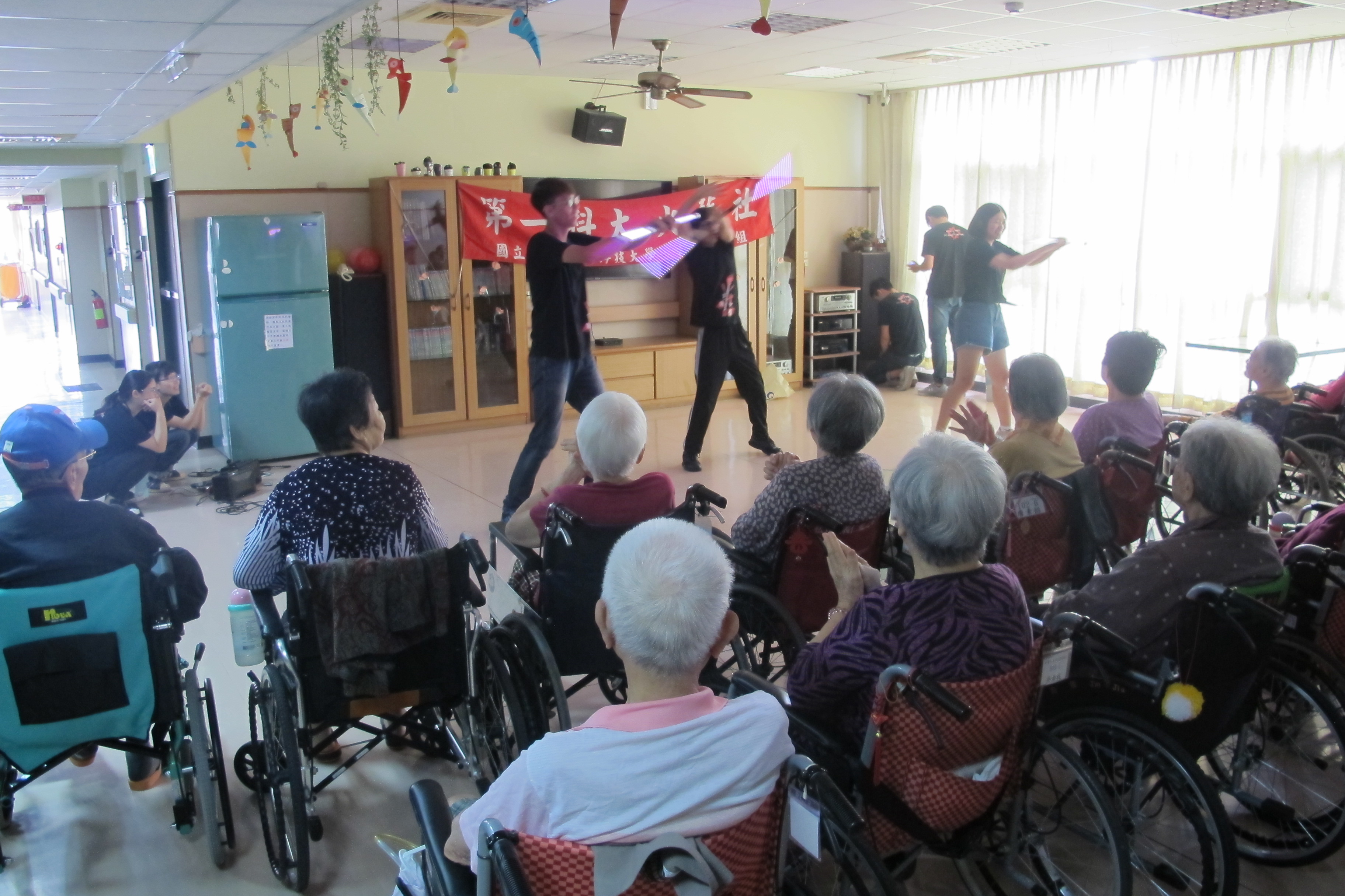 服務項目 活動剪影 志工團體 2018-08-07-高雄科大火舞表演 今天下午非常榮幸地邀請高雄科大的火舞藝術社學生來表演,在開頭充滿活力的自我介紹後,開始一系列精彩的表演,復古老歌與現代火舞完美的融合,讓許多長輩們沉浸在精湛的舞藝表演中,同時也帶動唱,讓長輩們開心地互動,在充滿歡笑聲中度過一個美好的下午。 返回