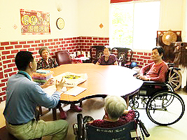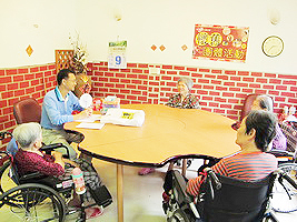 服務項目 活動剪影 日常活動 2015-06-09 藝術團體 今天的活動是藝術團體,在炎熱夏天裡需要一個東西來乘涼那就是扇子。先在一張紙上畫上大家所喜愛的花草動物圖案,再將紙一層一層摺疊起來形成扇狀加上一支桿子變成扇子,讓長者們非常有成就感。 返回