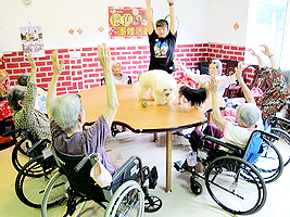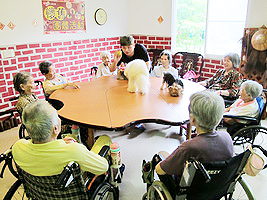 今天,志工帶了三隻小狗到本家舉辦寵物團體,除了讓長者們與小狗互動,還進行歌唱、運動等活動,長者們都覺得非常開心。