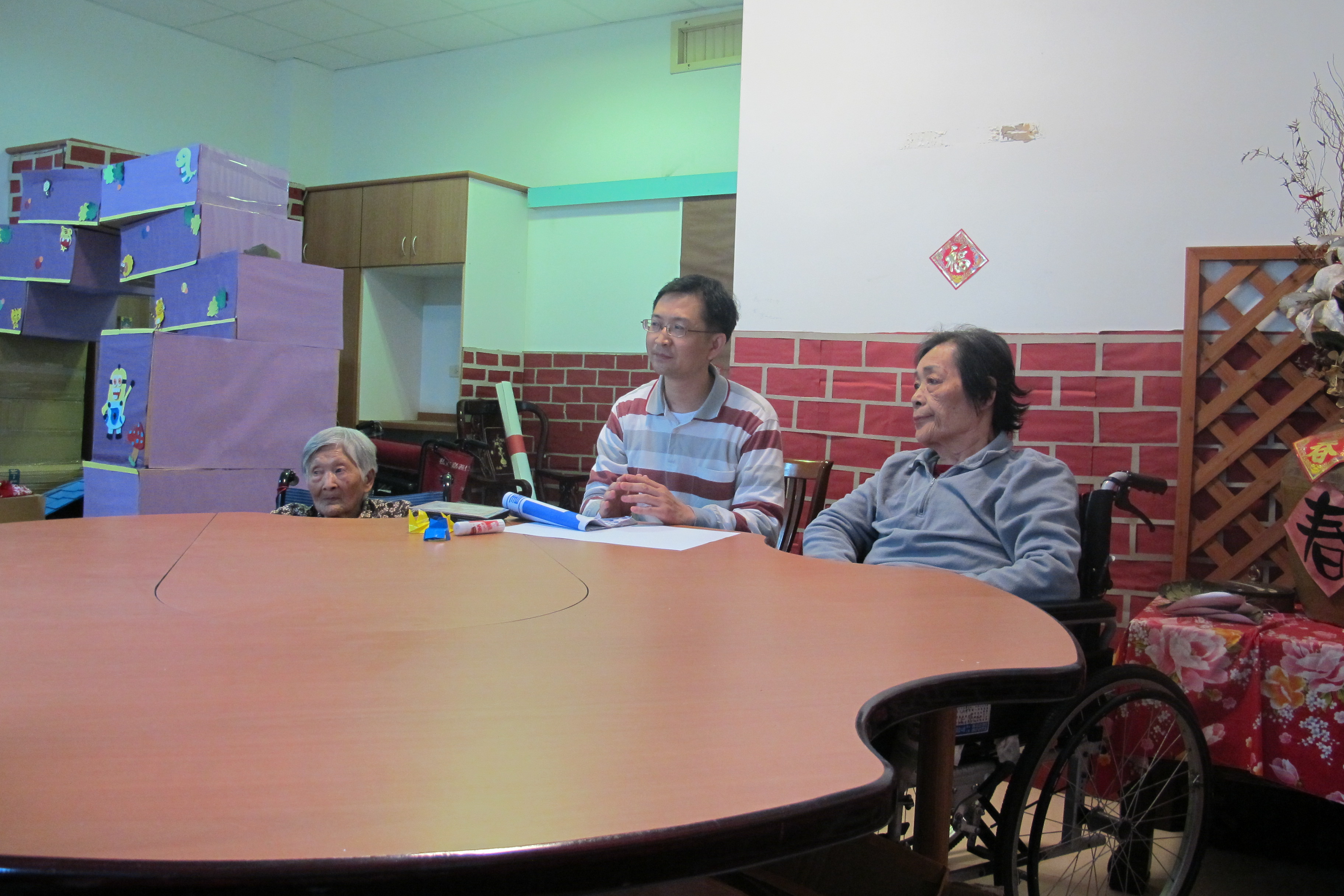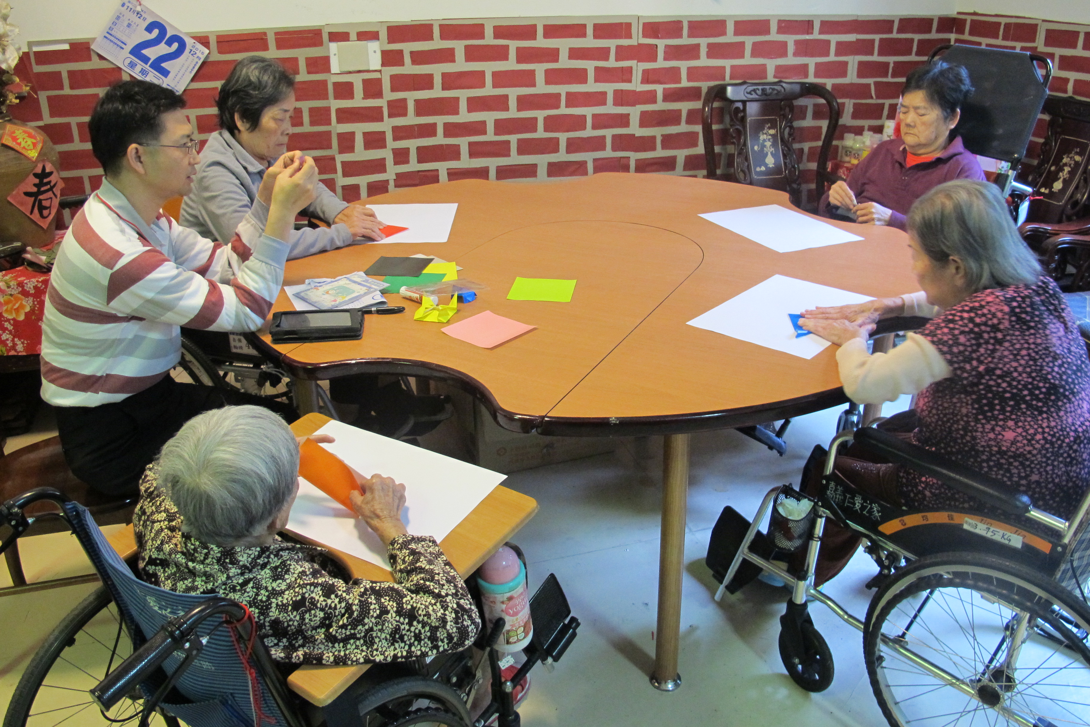 服務項目 活動剪影 日常活動 2015-12-22 藝術團體 今天下午為藝術團體的活動,首先發給長者A3及色紙,接著聽從領導者的指示,按部就班的摺出漂亮的小鳥形狀,然後將摺好的色紙黏貼在A3紙上,活動結束後,將長者們的作品張貼在樓層的走道牆壁上,展現出長者也可以做出屬於自己的作品。 返回