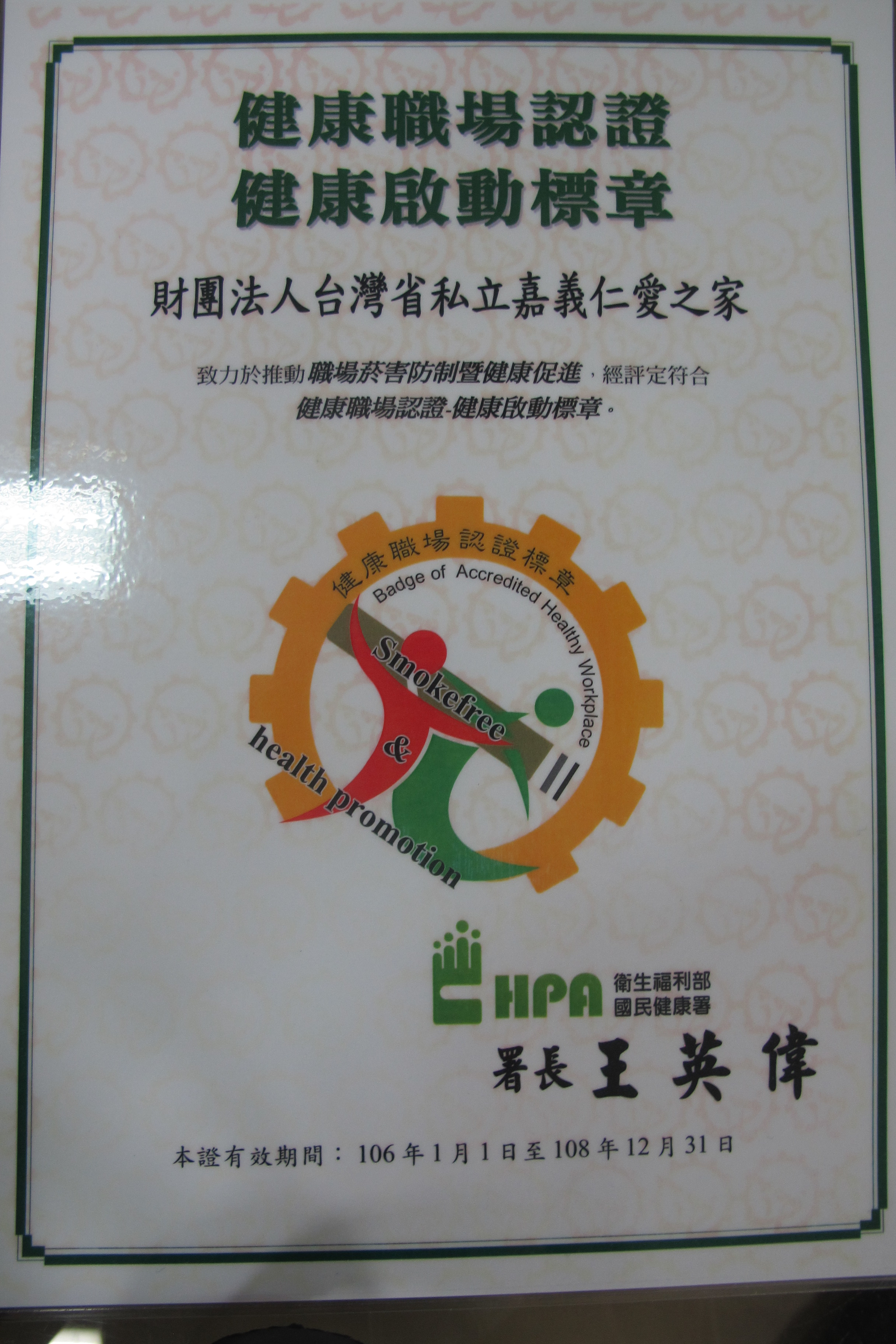 服務項目 活動剪影 日常活動 2017-01-26-賀!!本家機構獲得<健康職場認證> 賀!! 本家財團法人台灣省私立嘉義仁愛之家,致力於推動職場菸害防制暨健康促進, 經鑑定符合獲得【健康職場認證-啟動標章】。 返回